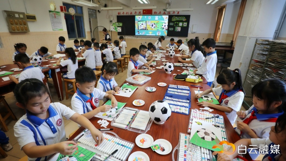 在该校的小学部体育课上,体育老师将古诗、数字等学科知识融入足球训练和游戏中,展现了“赛-学-练-赛”的教学闭环;英语课上,英语老师用足球、篮球等实物与学生进行拍球、传球等互动,开展英语教学;美术课上,老师让孩子们通过绘画了解足球的构成、特点等知识。